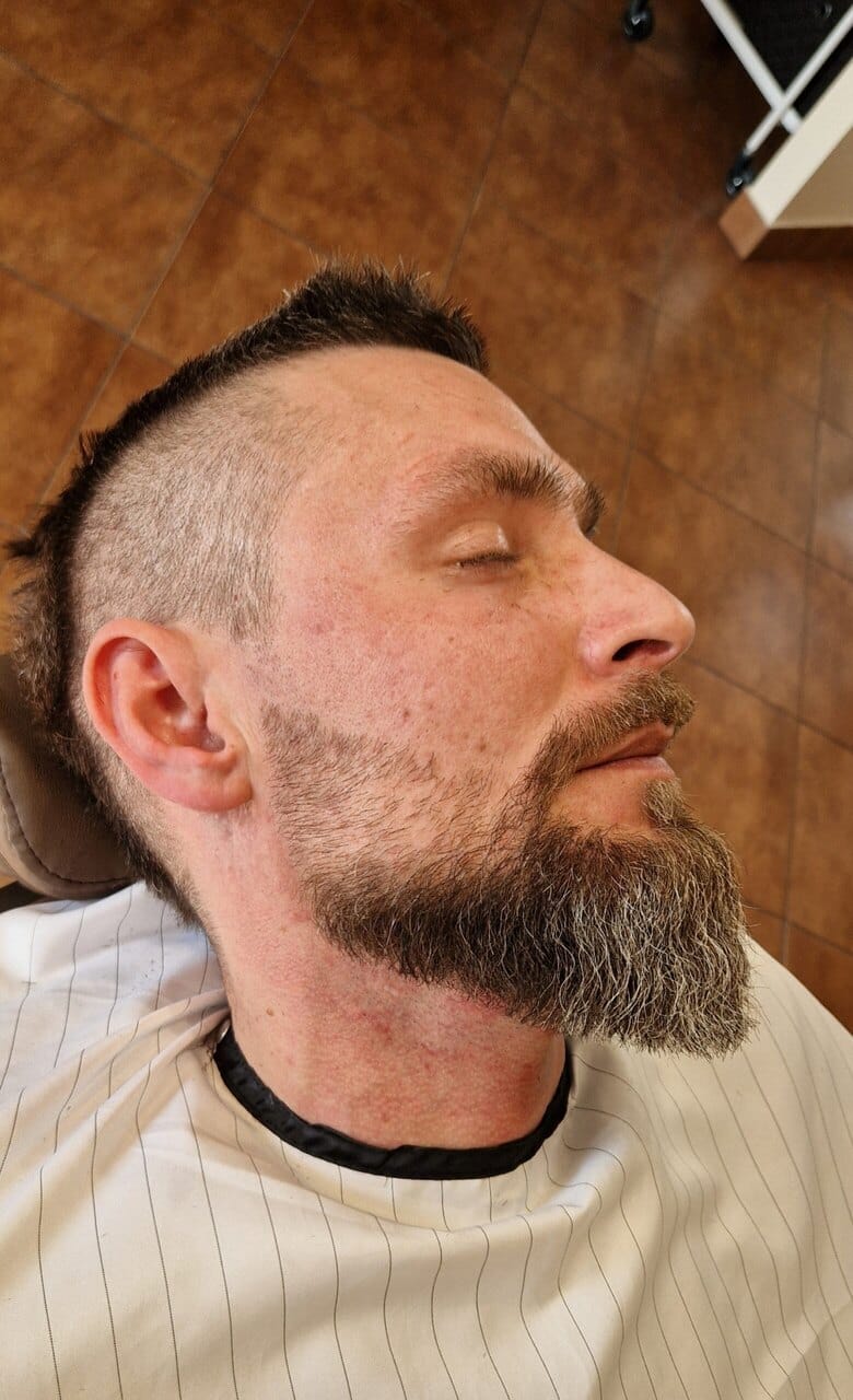Profesjonalny zabieg koloryzacji zarostu, mający na celu naturalne odsiwienie i wyrównanie koloru brody. Usługa wykonywana jest w pakiecie ze strzyżeniem włosów, zapewniając spójny, estetyczny i zadbany efekt.